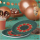 Paper plates with a golden mandala with burnt orange diyas on a dark teal gradient.