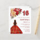 A modern, stylish and glamourous invitation for a Sweet 16, 16th birthday party. A white background, a girl wearing a red and gold dress and red, pink and golden roses, florals. The name is written with a modern hand lettered style script. Personalise and add your party details.
