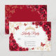 Red gold floral Quinceanera RSVP reply card. Features, script font, gold butterflies, watercolor roses and tiara. Perfect for an elegant princess style glam celebration. Personalize with your own details.