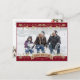 Elegant red and gold botanical photo Happy New Year postcard featuring a red photo frame adorned with holly, berries and falling snow on the front and a watercolor painting of poinsettia, holly and red berries at the back.