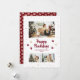 Modern red and gold photo Christmas card featuring three photos, snow and paw prints on the front and a paw prints background at the back. Easily personalize this cute photo Christmas card with your photos, family name and the year.