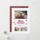 Modern red and gold photo Meowy Christmas card featuring three photos, snow and paw prints on the front and a paw prints background at the back. Easily personalize this cute photo Christmas card with your photos, family name and the year.