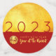 Modern design with golden textured paper (printed image) with large 2023 in red + small round Tiger paper-cut with yellow texts HAPPY NEW YEAR and Year of the Rabbit onto a red background. Design on party confetti. Matching party supplies, square flat invitation card, greeting card, holiday postcard and more... Perfect for a timeless and modern Chinese New Year of the Rabbit 2023.