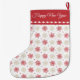 This pretty Christmas stocking features a pattern of red and gold snowflakes which are placed on a white background. At the top is a matching red border with a white diamond shape liner. "Merry Christmas" is in white script at the top. The back of the stocking has the same design, but with a second text field that currently says "Happy New Year". It's easy to change the text to personalise the message. Design credit for the pattern to https://www.etsy.com/shop/ephrazydesign.