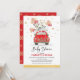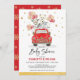 Festive baby shower invitation featuring cute artic animals, a vibrant red & gold car, balloons and sparkly stars