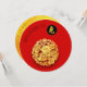 Composition with golden traditional Chinese paper-cut of a Rabbit into a decorated circle + small modern lettering for Year of the Rabbit 2023 and Chinese rabbit Ideogram Symbol onto a small black circle in front. Design on round flat card invitation with texts to customise for Chinese New Year of the Rabbit 2023 celebration onto golden textured paper (printed image) as background. Matching greeting card, holiday postcard and more...