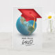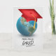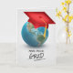 Red graduation cap with tassel on world globe for graduate congratulations.