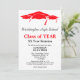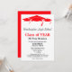 This vertical format minimalist class reunion invitation design features black and red text on an all white background with three red graduation caps as the top border. The back is a matching solid red. Personalise your information, remove information or edit using the design tool to select a font colour, size, and style your prefer.