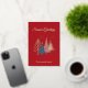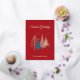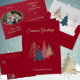 Cherry Red with 4 graphic Christmas trees in green pink and gold Christmas Card is stylish with a holiday feel. Each tree is individual and the colours are subtle and look great against the Christmas cherry red. The card can be personalised with your own photo, the year, your preferred holiday greeting and names. The card also coordinates with a range of Holiday Party stationary and party supplies.