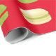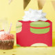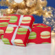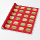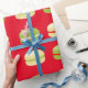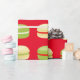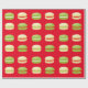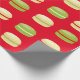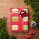 This stylish holiday design features French macaron cookies in festive colours of green and white, with red frosting. The background is a deep Christmas red. A very chic and Parisian way to celebrate Christmas!