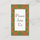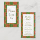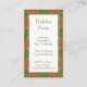 An elegant custom business card sized event ticket or party invitation with vintage block and script custom letters on a red and green holiday squares and a golden fleur-des-lis pattern.