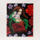 An auburn haired woman holding a Venetian masquerade mask wearing a red and green in a backdrop of black with red and purple flowers