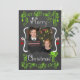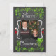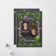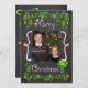 A chalkboard look background with beautiful scrolls of green with red stars and white text that reads "Merry Christmas" on front and "May all your days be merry & bright" on back. This beautiful customised holiday Christmas photo card has several star ornaments, and a bird in a nest design and areas you can easily add your names, the current year, and photo!
