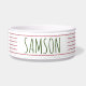 Personalised red and green stripe dog bowl in Christmas colours has a modern farmhouse aesthetic with multiple thin lines and dog's name printed on the outside. With the advanced template editor, you can change the font, background or stripe colours to match your decor or season.