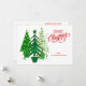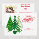 This fun and festive red, green, and white photo template Christmas trees holiday card have three green simulated metallic foil look Christmas trees with decorations and stars on it that are edged in gold. Decorative red wording on the front says "Merry Christmas" with a spot to personalise with your family name below. On the back, you can upload your own digital photo into the photo template area and you can customise the text boxes to say whatever you want. There is also another smaller green tree on the back that can be removed if you don't want it.