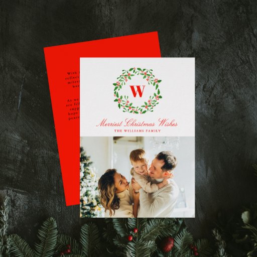 Red Green Wreath Monogram and Photo Christmas Envelope