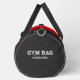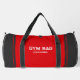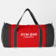 Sleek and customisable gym duffel bag design with minimalist text reading "Gym Bag" and personalised name text in white. The bag features a stylish combination of red and dark grey, making it the perfect gift for a friend who appreciates personalised items.