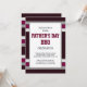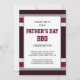 This bold, masculine design features red and grey stripes on a deep reddish brown background. The customisable text for the type of Father's Day event (BBQ, cookout, brunch, dinner, party, etc.) and location, RSVP and contact details appear inside a gold edged white area in the centre in popular, masculine red and black typography on the front of the card. The back of the card features the same bold blue and beige stripes.