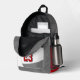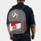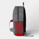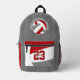 This volleyball themed backpack for girls or boys is accented with the realistic image of a volleyball that has red, grey and white panels - the front pocket features the oversized image of that same volleyball, upon which you can easily personalise the athlete's name and jersey number - customise with school / club name and team mascot name encircling the top of the smaller volleyball graphic - you can customise the backpack's colours, currently red & grey - a digitally-created, texture-look graphic overlies the backpack's grey components for a distressed appearance, which can be removed if desired - by katz_d_zynes