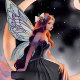 Watercolor and fairy sitting on a rock in the moon lite night sky. Butterfly wings, red hair fairy, watercolor design. Inside has a nice message for girl birthday, but this card can be used for any celebration. Both side of inside card are the night sky with clouds and glitter effect.