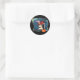 Red-haired Witch II, a cool illustration featuring a beautiful red-haired witch holding an enchanted jack o’ latern while sitting on a pumpkin and an ornate frame with a crescent moon. Main colours: blue, red, orange, black, purple and yellow. The original drawing was made with coloured pencils and acrilycs by artist © E. D. Siffert.
