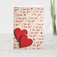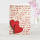 This Valentine’s Day card features two deep red wooden hearts resting in the lower-left corner, gently overlapping as if leaning into each other. Their matte surfaces show faint wood grain, and soft shadows give them a grounded, realistic feel. Behind the hearts, the entire background is filled with the phrase “I love you!” repeated over and over in thin red lettering that looks neatly handwritten. Small red heart icons appear between the lines, adding extra warmth to the scene. The creamy white background allows the red tones to stand out clearly. With both texture and pattern working together, this card feels romantic and comforting, making it a lovely way to share affection with someone special.