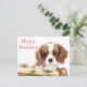 This fun canine postcard features an image of a tan and white Cavalier King Charles Spaniel puppy dog with her paws on a wood basket rim highlighted against a crisp white background with Happy Birthday printed in a bold red handwritten font.