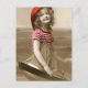Vintage photo of cute little girl wearing a red hat and holding a toy sailboat