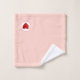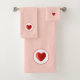Elegant towel set with beautiful red heart on white and coral pink background. Chic modern towel set.