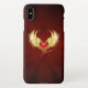 Bright red heart of an angel with golden wings shining in the dark radiant red background decorated with a pattern.