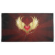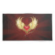 Bright red heart of an angel with golden wings shining in the dark radiant red background decorated with a pattern.
