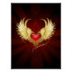 Bright red heart of an angel with golden wings shining in the dark radiant red background decorated with a pattern.