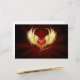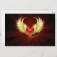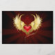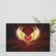 Bright red heart of an angel with golden wings shining in the dark radiant red background decorated with a pattern.