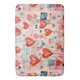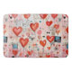 A bath mat with a fun mixed media style pattern. Big red hearts and various random shapes scattered around making a delightfully cute pattern.
