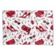 Seamless pattern : red high heels shoes, small bags, lipstick, perfume, nail polish, sun glasses, jewellery on white. Pretty, feminine, glamour beauty design for textile, wrapping paper, notebook cover