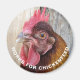 Humourous, round style magnet for the home or work office that features the photo image of a red chicken hen along with the words, WORKS FOR CHICKENFEED printed in bold, white lettering.