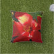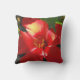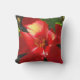 The image on this Throw Pillow is an original photograph by ZoeSPEAK of a red hibiscus flower. In the photo, the centre of the bloom is blasted by very bright sunlight peeking through an opening between the yellow green leaves of the bush. The yellow stamen is surrounded by the bright red petals of the flower, which look yellow where the sun is the brightest. The rest of the flower falls into the shadows in a deep red colour against the olive green leaves.