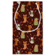 Cute and festive Christmas gift bag featuring hand drawn illustration of cats and dogs with Christmas lights. The background is red.