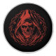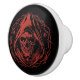 This Gothic drawer or door knob has a deign of a red hooded skull in a barbed wire frame on a black background.