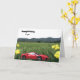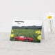 Mountain peaks with grassy field with wild yellow flowers. A red hot sports car featured. Wish someone a fabulous birthday.