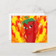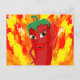A red and hot pepper cartoon character. Original design. Fire flames in the background.