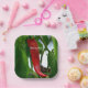 These spicy hot paper plates in the colours of the Italian Flag, green, white and red, features the photographic image of a red hot chilli pepper against green leaves with hints of white. The text is customisable for a Name or your own text.