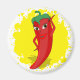 A red and hot pepper cartoon character. Original design with yellow paint splash background.