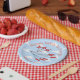 Customizable Red Jet Planes party plate. Nine red aerobatic planes fly through the blue sky in celebration with red, white and blue trails!