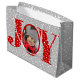 Red JOY and snowflakes two photo Christmas large gift bag. It features the word "JOY" in red with photos inside the letter "O" and snowflakes -polka dots- on grey.
