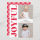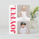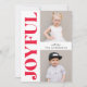 Stylish, modern holiday photo card featuring "Joyful" in a trendy, bold red font along the left side of the card. Personalise the front of the card by adding two of your favourite photos and your name. The cute holiday card reverses to a chic white plaid pattern with a red background.