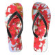 The image on these wide strap Flip Flops is an original photograph by MaeFlowers of a kalanchoe plant in bloom with red flowers. The overhead view shows the bright red petals against a pale, pastel tinted background, with a hint of green leaves and terracotta flower pot.