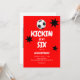 Kid's birthday party invitation. 6th birthday. Kickin it at six. Soccer. Red.