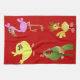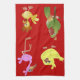 Red kitchen towel with animals. Parrot, chick, rooster and pink flamingo. Great gift idea.