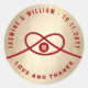 Modern minimalist double happiness knot of union, love and marriage in deep red and faux gold foil, 'love and thanks', wedding party favour sticker / envelope seal.